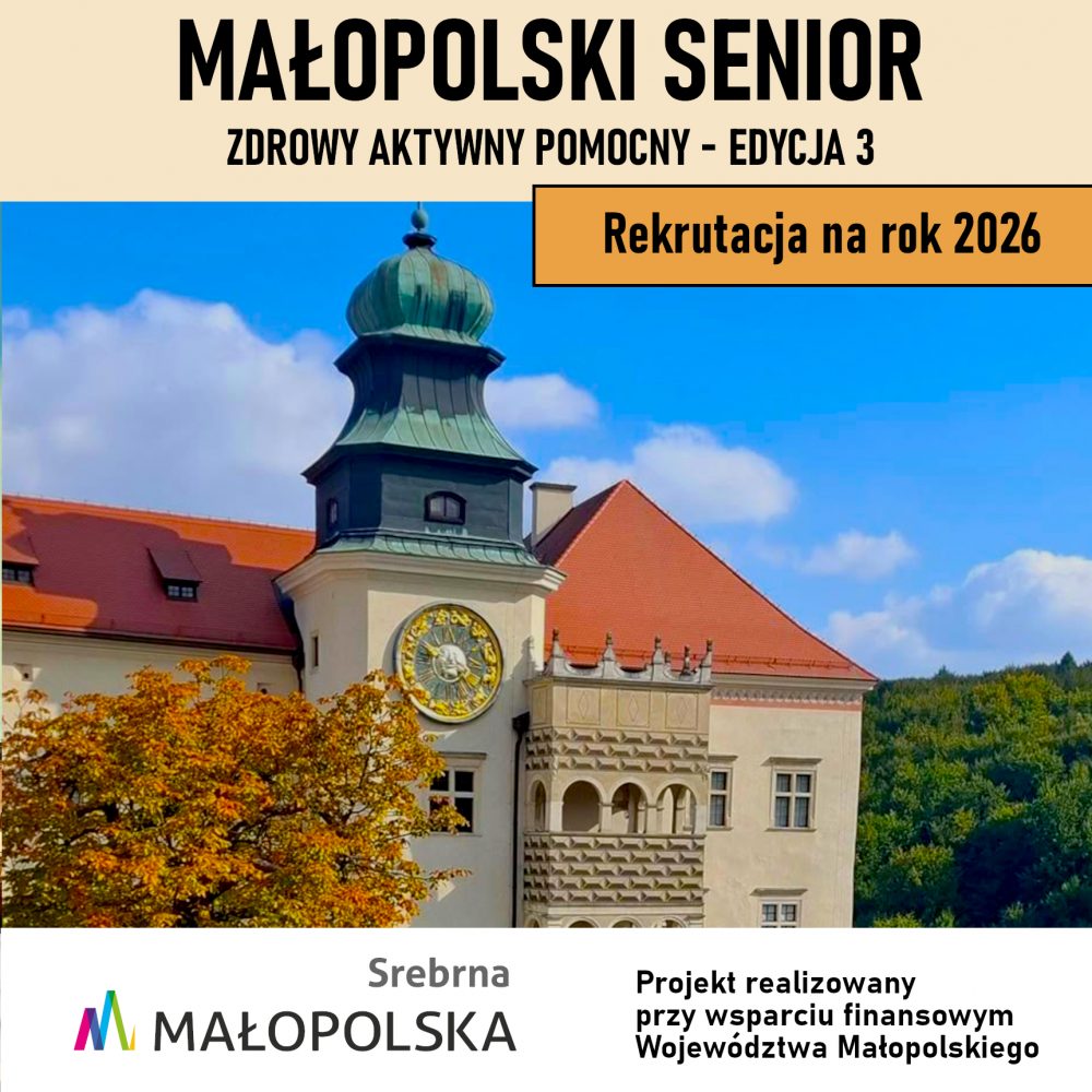 Zadanie jest realizowane przy wsparciu finansowym Województwa Małopolskiego w ramach Otwartego konkursu ofert na realizację zadań publicznych Województwa Małopolskiego w zakresie działalności na rzecz osób w wieku emerytalnym pn. „Małopolska uczy i pomaga przez całe życie”.