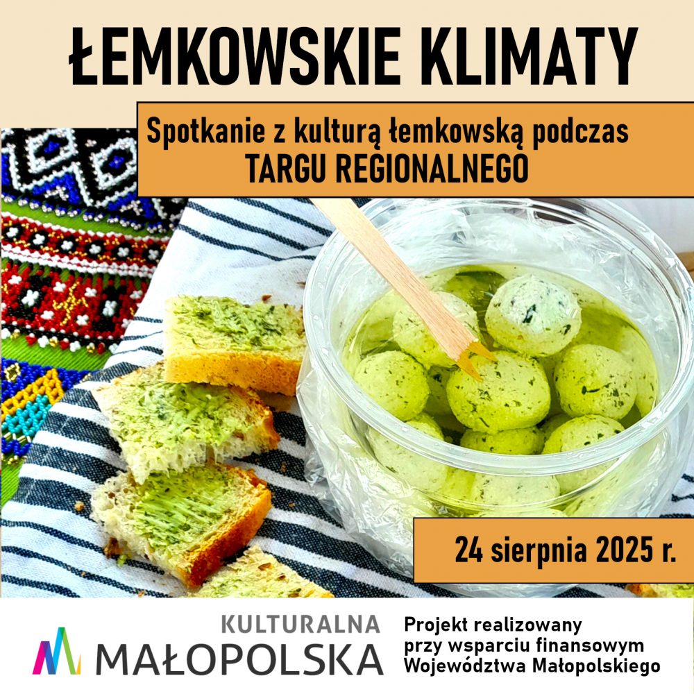 Sierpniowej edycji Targu Regionalnego towarzyszyć będzie specjalne wydarzenie- SPOTKANIE Z KULTURĄ ŁEMKOWSKĄ . Będzie to okazja do poznania kuchni, obyczajów i tradycyjnego rękodzieła tej grupy etnicznej zamieszkującej m.in. tereny Beskidu Niskiego, Sądeckiego czy Bieszczad.